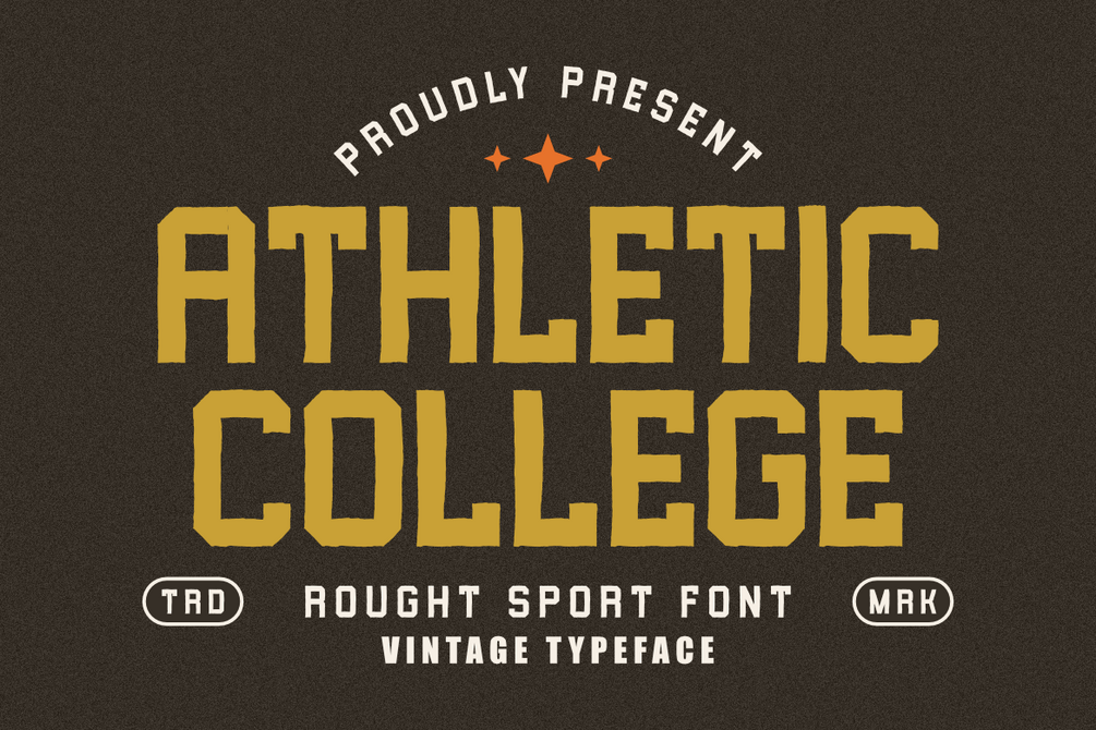 Athletic College is a robust rough sport font with a distinct vintage aesthetic. This typeface brings a powerful and energetic feel, reminiscent of classic athletic department logos and collegiate branding. Its sturdy, weathered texture and bold presence make it an excellent choice for sports-related designs, team merchandise, event posters, retro-inspired logos, and any project requiring a strong, authentic vintage sport vibe. Infuse your designs with the competitive spirit and timeless character of Athletic College.