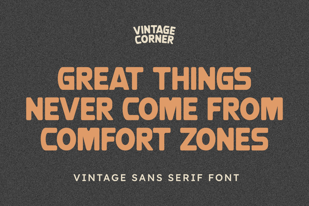 Add a touch of warm nostalgia to your designs with Vintage Corner, a charming vintage sans serif font. This typeface features rounded edges and a friendly, approachable aesthetic, reminiscent of classic signage and retro branding. Its smooth curves and inviting character make it a wonderful choice for logos, packaging, posters, social media graphics, and any project seeking a genuine vintage feel with a contemporary twist. Bring a comfortable and familiar vibe to your creative work with Vintage Corner.
